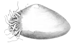 A colony of hydrozoan Monobrachium parasitum on the Macoma calcarea shell.