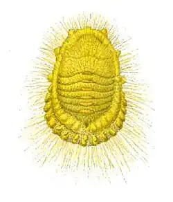 Giant scales have an elongated oval body; many species grow to a length of one centimetre long and the African species Aspidoproctus maximus achieves 35 mm long.[6] The adult females of the family have six dark coloured legs and conspicuous antennae. Most genera have a waxy coating but some do not. Various species have some form of ovisac or marsupium.