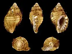 - Apertural view of Monoplex parthenopeus echo (Kuroda & Habe in Kira, 1961) with operculum and periostracum attached