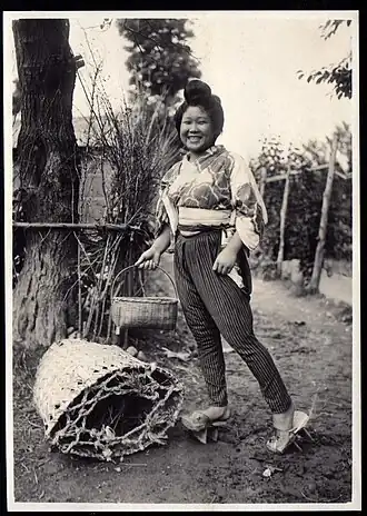 Monpe was popularised as an informal uniform in Japan during the 1930s and 1940s, and Pacific War, because it used existing materials within the home and could be easily altered and repaired, and this was a necessity in wartime. However, as it came to be worn by the majority of urban working-class women, it transformed into a symbol of Japan's wartime deprivation.[5] It was also criticised for its unfeminine qualities, in comparison to kimono or Western-style clothing (yōfuku), deemed "too frivolous" in wartime.[6]