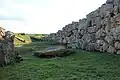 The surroundings of the Monte d'Accoddi have been excavated in the 1960s, and have provided the signs of a considerable sacred center. Near the south-eastern corner of the monument there is a dolmen, and across the ramp stands a considerable menhir, one of several standing stones which was formerly found in the vicinity. The foundations of several small structures (possibly residential) were excavated, and several mysterious carved stones. The most impressive of these is a large boulder carved into the shape of an egg and then cut through on a subtle curving three-dimensional line.[5][12]
