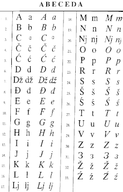 | Latin | A | B | C | Č | Ć | D | Dž | Đ | E | F | G | H | I | J | K | L | Lj | M | N | Nj | O | P | R | S | Š | Ś | T | U | V | Z | Ž | Ź |