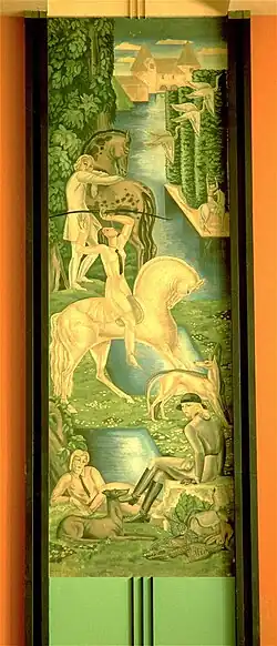 Lady Eaton, the wife of the multi-millionaire owner of the Eaton's department stores, gave her interpretation of "class and style" to the major Eaton's stores. In 1925 Eaton's purchased the three-storey Goodwin building[1] at 677 Saint Catherine Street West and commissioned architects Ross & MacDonald to build it up to six storeys in 1927. The top three floors were added in 1930–1931.[2] On January 26, 1931, Lady Eaton opened a large Art Deco restaurant on the 9th floor of the building. The restaurant was designed by architect Jacques Carlu, and[3] the floor-to-ceiling mural at the back of the restaurant was created by his wife Natacha Carlu.[4] It was patterned on dining hall of the transatlantic liner SS Île de France. The 9th floor corridor between the elevators and restaurant is also in the Art Deco style.