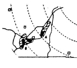 1) Hatch lines are contours of 19 dBZ, and black areas are echoes of 47 dBZ or more.