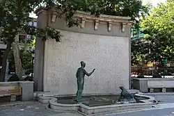 Aside from a stone medallion designed by Federico Marés with the effigy of d'Ors and his birth and death dates,[2][4] the back side facing the Casa Sindical displays an inscription reading: "a la memoria del magisterio orsiano. en mcmlxiii dedica madrid esta fuente siendo alcalde el xvi conde de mayalde" ("To the memory of the Orsian teachings. Madrid dedicates this fountain in 1963 being mayor the 16th Count of Mayalde).[1]
