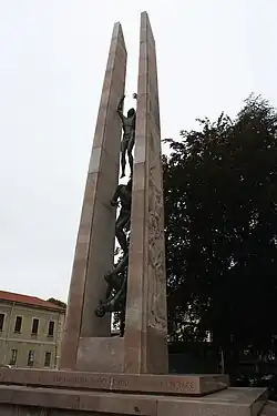 A war memorial[38][39] was placed in the center of the Vittorio Emanuele II Square in front of it in 1958, which was dismantled on August 23, 2010 and then moved to Trento and Trieste Square. It was planned to restore the buildings in Vittorio Emanuele II Square by 2012, with the construction of an underground parking garage.[40]