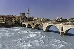 - The Pietra bridge is the oldest bridge in Verona, located near the Roman theater, in an area that from prehistoric times must have featured a ford, a crucial meeting point between different communication routes to which the city's birth is due. A first wooden bridge was put in place during the construction of the Via Postumia in 148 B.C. at the same spot where the ford was, later replaced by the stone one, of which the two left arches, made of opus quadratum, have come down to us intact. In the imperial age it underwent a major restoration during which the depiction of a river deity was placed on the keystone ashlar of the second left arch.[82] Much more troubled was the life of the monument in the medieval centuries, when the three right arches suffered damage and partial collapse due to the flooding of the Adige River. In 1298 the Lord of Verona Alberto della Scala had the cityward tower restored and the adjacent archway rebuilt, while in 1508 the City Council commissioned Fra' Giocondo to oversee the reconstruction of the two arches that still needed repairing.[83] However, the bridge suffered its most serious damage on April 24, 1945, when it was undermined and detonated by retreating German soldiers, a blast that left only the cityward archway intact. Superintendent of Monuments Piero Gazzola, supported by the entire public, chose to rebuild the bridge as it was and where it was, thanks to the technical collaboration of Veronese architect Libero Cecchini and the specialized contribution of historians, archaeologists, engineers, university professors, and various other experts and technicians.[84]