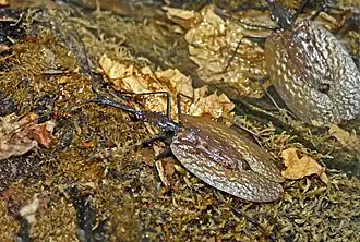 Mormolyce phyllodes can reach a length of 60–100 millimetres (2.4–3.9 in).[5] These beetles possess a flat, leaf-shaped, shiny black or brown body with distinctive violin-shaped translucent elytra (hence the common name). This characteristic mimicry protects them against predators, while their flat shaped body allow them to dwell in soil cracks or under the bark and leaves of trees. Head and pronotum are very elongated, with long antennae and the legs are long and slender.[5][6]