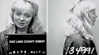 ![]() 1984 mugshot taken of perpetrator Joyce McKinney when subsequently arrested in 1984 in Salt Lake City, Utah, on charges she again was stalking her 1977 victim, Anderson | |