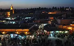 Morocco's modern Arabic name is al-Maghrib (المغرب, transl. the land of the sunset; the west), with the Kingdom's official Arabic name being al-Mamlakah al-Maghribīyah (المملكة المغربية; transl. the kingdom of sunset/the west).[29][30][31] In Turkish, Morocco is known as Fas, a name derived from its medieval capital of Fes which is derived from the Arabic word Faʾs (فأس; transl. pickaxe), as the city's founder Idris I ibn Abd Allah reputedly used a silver and gold pickaxe to trace the outlines of the city.[32][33] In other parts of the Islamic world, for example in Egyptian and Middle Eastern Arabic literature before the mid-20th century, Morocco was commonly referred to as Murrakush (مراكش).[34] The term is still used to refer to Morocco today in several Indo-Iranian languages, including Persian, Urdu, and Punjabi.[35]