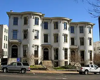 Morson's Row, also known as James Morson's Row, is a set of three historic rowhouses located in Richmond, Virginia. They were built in 1853, and are three-story, three bay brick structures with flat roofs. They feature Italianate style heavy bracketed cornices, arched door enframements, and elaborately molded consoled lintel over the windows. The distinctive feature of the row is the off-center, two-bay bow on each house.[3]