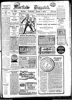 The Mortlake Dispatch was first published in 1869 using the title Mortlake Dispatch: and commercial, agricultural, and pastoral advertiser. By 1883, William Manson was the owner and in 1884 the newspaper name was shortened and the subtitle removed. Following William's death in 1903, his son John William Manson became editor. Within a few years John also died and his sister Mary Swinton Manson became the printer and publisher and her mother Mary Manson was the proprietor. Mary Swinton Manson married William Bray who became the newspaper proprietor on her death in 1943. On William's death in 1962 ownership passed to William and Mary Swinton's daughter Bonds Manson Bray. In 1967 records indicate that Miss Bray sold the newspaper to Ian Barker (Dandenong Journal, Foster Mirror) before the Western District Newspapers took over ownership in 1970.[1]