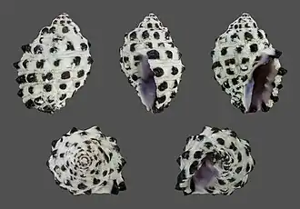 Morula uva has a shell that can be either colored white or purple with rows of dark tubercles.[2] The mouth has a shade color of light violet with toothlike projections.[2] There are various sizes and lengths of M. uva, some can be 15mm by 9mm, others can be smaller.[2]