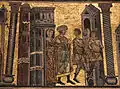 | Joseph Given Command over Egypt | It differs from the preceding scenes by a richer palette of colours, though this could be due to a different mosaicist, whilst its lively composition in almost pathetic tones may attribute them to the Master of the Maddalena (Pesenti, 1978–1979). | |