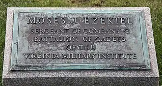 Ezekiel died in his studio in Rome, Italy during the First World War,[32] and was temporarily entombed there. In 1921, he was reinterred at the foot of his Confederate Memorial in Section 16 of Arlington National Cemetery. The inscription on his grave reads "Moses J. Ezekiel Sergeant of Company C Battalion of Cadets of the Virginia Military Institute."