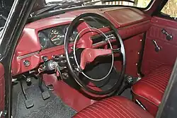In 1969, both the 412 and the related 408 had their bodies redesigned. These were notable for being the first Moskvitch models to feature rectangular headlights and horizontal rear lights, which passed on to the 2138/2140 in 1976, replacing round headlights (two on ordinary models, four mainly on export models) and vertical rear lights. Only rear triangular turn signals remained on vestigial tailfins. Until then, the M-412 profited from heightened tailfins and tanned headlight lamps on export models. The first series Moskvich 412 (1967-1969) is quite rare today as they were more expensive and thus built in lower numbers than the 408. Another notable (but not unique, as it was used in other Russian cars at the time) feature were the so-called side signals, mounted on the C-pillars on some vehicles and similar to the American "opera lights". The designers "had paid real attention to passive safety,"[8] the car was crash-tested, met the standards of safety adopted by the UNECE,[2] and received an international safety certificate as a result of almost five months of tests in France.[9][10] It was upgraded with dual-circuit braking system with power assistance (servo), disc brakes on the front wheels since 1970 (models with front drum brakes continued to be built, but for certain markets, like western Europe, were delivered with brake discs, but even in East Europe models with brake discs at the front were available, in parallel with drum brakes versions), reinforced car-body structure, and passive safety features such as soft grip steering wheel cover, soft interior parts, seat belts, and padded dashboard. It was the first Moskvitch to pass safety-features tests in France, Bulgaria, Czechoslovakia, and Sweden in 1970–71, and in Western Germany in 1972.[2] The modernized model, both for export and domestic market, received a factory code M-412IE (IE for "export rendition"), to mark, that it fulfils new safety requirements.[11]