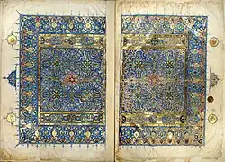 The size of the main qibla iwan was frequently acknowledged as an awe-inspiring achievement, with Mamluk historians like Maqrizi claiming it was greater than the famous arch of the Sassanid Persian palace of Ctesiphon (still the largest single-span vault of brickwork in the world today).[5] The iwan of Sultan Hasan's mosque is not actually as large as that arch, but the comparison nonetheless emphasized the building's legendary reputation.[1][3] This iwan is also richly decorated. A monumental inscription in Kufic style, set against a swirling vegetal arabesque background, runs along the entire length of the iwan and is unique in Mamluk architecture. The text is a fragment of the Surat al-Fath (Sura of Victory) from the Qur'an.[1] Below this inscription band, the qibla wall is covered in multicolored marble paneling, centered around the mihrab (the niche symbolizing the direction of prayer) which is framed by its own golden inscription and whose central half-dome hood features a sunrise motif radiating from the word "Allah". The stone and marble minbar (pulpit) next to it may have once been covered in inlaid geometric patterns like that on the minbar of the Mosque of Aqsunqur, but this is not visible today.[1] The minbar does still feature finely crafted bronze doors with geometric patterns. A dado of marble also runs along the other two walls of the iwan, although at a much shorter height. A stone platform, known as a dikka, stands in the middle of the space and was where reciters of the Qur'an would recite aloud for communal prayers.