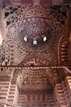Inside, the chamber is even more lavishly decorated, with multicolored marble mosaic paneling on the lower walls and a large painted inscription of the Throne Verse, carved in wood, running around the entire chamber above this.[2] The marble mihrab is similar to the one in the main qibla iwan of mosque. The square chamber transitions gradually to the round dome (12 meters in diameter) with the use of wooden pendentives, typical of Mamluk architecture, which are sculpted into muqarnas forms and richly painted and gilded.[2]