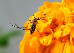 Mosquitoes can develop from egg to adult in hot weather in as few as five days, but it may take up to a month.[13] At dawn or dusk, within days of pupating, males assemble in swarms, mating when females fly in.[14] The female mates only once in her lifetime, attracted by the pheromones emitted by the male.[15][16] In species that need blood for the eggs to develop, the female finds a host and drinks a full meal of blood. She then rests for two or three days to digest the meal and allow her eggs to develop. She is then ready to lay the eggs and repeat the cycle of feeding and laying.[14] Females can live for up to three weeks in the wild, depending on temperature, humidity, their ability to obtain a blood meal, and avoiding being killed by their vertebrate hosts.[14][17]