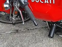 Various kinds of sliders, called frame sliders, frame protectors, fairing protectors, or crash bobbins, are attached to motorcycles with the intention of minimizing damage to the bike's fairings, frame, engine, and other parts, in the event of a crash, or an accidental tip over. They are made of plastics, such as Delrin, acetal, or nylon, or sometimes aluminum. Frame sliders are usually located and installed on the engine bolts on both sides of the fairings.[7][8][9] Front or rear axle sliders, also called fork sliders and swing-arm spool sliders provide some potential damage reduction for the suspension components, wheels, and other parts by making contact with the ground before the rest of the bike. Hard-mounted foot pegs, which do not fold upward can also serve as a buffer between the ground and the bike's frame and components.[10]