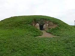 The Mound of the Hostages (Irish: Dumha na nGiall) is an ancient passage tomb located in the Tara-Skryne Valley in County Meath, Leinster, Ireland. The mound is a Neolithic structure, built between 3350 and 2800 BC.[1] It is circular in form, roughly 15 metres in diameter and three metres high. It is built in the same style as the Newgrange tomb. The structure is dome-shaped with an inset for the entrance and a small doorway, set almost one metre into the side of the monument. The doorway is framed with undecorated standing stones. As is common in passage tombs, this alignment allows for the rising sun to shine down the passageway at only two times of the year, illuminating the chamber within. At this mound, the passage is illuminated on the mornings of Samhain and Imbolc,[2] at the beginning of November and February, respectively. Inside, the passage into the Mound of the Hostages stretches for four metres in length, one metre in width, and is 1.8 metres high. It contains decorated siltstones with images of swirls, circles, and x-patterns—designs associated with Neolithic passage tomb art. Three compartments once housed buried remains.