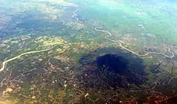 Mount Arayat stands in the middle of the largely-agricultural 15 to 35 metres (49 to 115 ft) AMSL Central Luzon Plain, serving as a distinct landmark in Pampanga province.[8] The mountain is topped by a circular volcanic crater about 1.2 kilometres (0.75 mi) in diameter, much of which has collapsed on the western and part of the northern rim due to erosion. This has resulted in a breached crater which opens in a west-northwest direction. This area is the apparent source of a major debris-avalanche deposit that forms hummocky terrain beyond the west and northwest sides of the volcano. The 1,026-metre (3,366 ft) summit stands on the northeast side of the breached crater, known as North Peak, while the 984-metre (3,228 ft) Pinnacle Peak is located on the southeast crater rim.[9] Post-collapse activity formed an andesitic lava dome known as White Rock in the collapse amphitheater.[1]