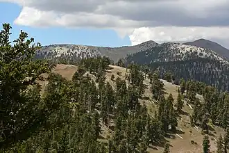 ![]() Bristlecone pines blanket the high ridge between Charleston and Griffith Peaks. | |