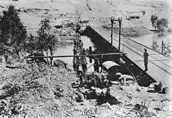 As part of these improvements, a new weir was constructed across the river between the 1899 bridge and the intake tower. The new weir incorporated a vehicle overbridge with a tramway to replace the older bridge. Electric haulage of the coal wagons was continued across the new overbridge, with the haulage winch shifted to the north on the west bank. The design of the weir allowed floodwaters to flow through concrete pillars and, theoretically, spare the overbridge from damage. Plans were approved in 1921 and the work was completed in 1925.[76][77][78][79] In February 1927, major flooding damaged the new weir and all but destroyed the 1899 bridge, with one report saying "the main course of the Brisbane River has been altered by a huge washaway that carried away in the flood many thousands of tons of earth, tearing a chasm 50 yards wide and 20 feet deep at the end of the composite weir and bridge, and leaving the railway swinging in the air like a clothesline".[80] The floodwaters gouged out a large section of the west bank leaving a 76m section of tramline swinging in the air. The cost to repair the damage was considerable as the weir and overbridge required further extension and stronger footings at the west bank. This was completed in 1928.[81][82][1]