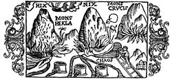 In the Flatey Book Annal it was recorded that during the 1341 eruption, people saw large and small birds flying in the mountain's fire which were taken to be souls.[8] In the 16th century Caspar Peucer wrote that the Gates of Hell could be found in "the bottomless abyss of Hekla Fell". The belief that Hekla was the gate to Hell persisted until the 19th century.[7] There is still a legend that witches gather on Hekla during Easter.[9]