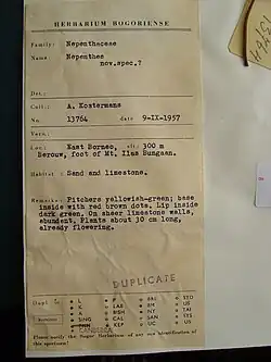 Botanist A. J. G. Kostermans explored Mount Ilas Bungaan between September 8 and September 19, 1957, as part of an expedition to northeastern Borneo.[4] During this time, Kostermans made the first known collection of the rare pitcher plant Nepenthes campanulata, which grew on the "sand and limestone walls"[5] of the hill's 100 m high rock face.[3] He wrote the following account of his discovery:[1]