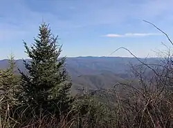 The Jumpoff Trail crosses the summit en route to the Jumpoff, a high cliff on the mountain's northern slope. The view from the Jumpoff is usually greater than 180 degrees, from Mount Le Conte to the northwest to the Balsam Mountains to the southeast. The Jumpoff Trail is just a few feet beyond the Appalachian Trail and The Boulevard Trail intersection, approximately three miles from Newfound Gap.