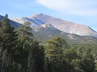 Mount Meeker is a high mountain summit of the Twin Peaks Massif in the northern Front Range of the Rocky Mountains of North America. The 13,916-foot (4,242 m) thirteener is located in the Rocky Mountain National Park Wilderness, 4.8 miles (7.7 km) west by north (bearing 285°) of the community of Allenspark in Boulder County, Colorado, United States.[1][2][3]