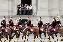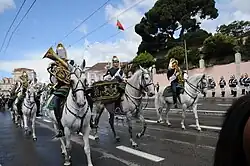 The Charanga a Cavalo is part of the State Honors and Security Unit (former GNR Cavalry Regiment) and usually parades with the horse squadrons of the GNR, including with Presidential Squadron in the guard mounting ceremony of the Presidencial Palace. This mounted band is the only band of its kind in the world that is able to play while galloping.[17]