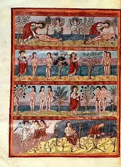 The Moutier-Grandval Bible is an illuminated manuscript bible of about 840, which was probably written in Tours, France, perhaps specially for the abbey. It was owned by them until the dissolution in the French Revolutionary Wars, when it was apparently forgotten and found in Delémont by children. It is now in the British Library (MS Addl. 10546 [5]). There are three full pages with miniatures, two showing scenes from the Book of Genesis: the story of Adam and Eve over several registers like a "strip cartoon", Moses receiving the Tablets of the Law and teaching them to the Israelites in two scenes, and an allegorical page with two scenes at the end of the book.[6] A facsimile was published in 1971 (Die Bibel von Moutier-Grandval, ed. J. Duft, Bern 1971).