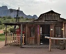 Located in the town of Apache Junction, Arizona, the Apacheland Movie Ranch and Apacheland Studio[3] was developed from 1959 to 1960 and opened in 1960. Starting in late 1957, movie studios had been contacting Superstition Mountain-area ranchers, including the Quarter Circle U, the Quarter Circle W, and the Barkley Cattle Ranch, for options to use their properties as town sets. One notable production during this time was Gunfight at the O.K. Corral (1957) with Kirk Douglas and Burt Lancaster. Though historically inaccurate, it features the area known as Gold Canyon, with the Superstitions prominent behind the movie's representation of the Clanton ranch. During this time, Victor Panek contacted his neighbors in Apache Junction, Mr. and Mrs. J.K. Hutchens, to suggest the idea of building a dedicated studio in the Superstition area. Hutchens and Panek found a suitable site that was developed into Apacheland, intended to be the "Western Movie Capitol of the World".