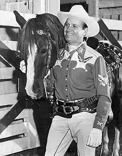 Gene Autry, actor, western singer, and producer, purchased the 110-acre (45 ha) 'Monogram Ranch' property from the Hickson heirs in 1953. He renamed the property 'Melody Ranch' after his 1940 film of the same name, and his following Sunday afternoon CBS radio show (1940–1956) and . A brushfire swept through 'Monogram Ranch' in August 1962, destroying most of the original standing western sets. The devastated landscape was useful for productions such as Combat!. A large Spanish hacienda, and a complete adobe village survived on the northeast section of the ranch.[33]