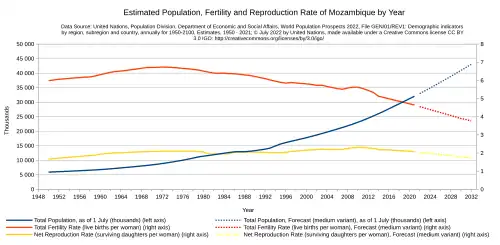 Registration of vital events is in Mozambique not complete. The website Our World in Data prepared the following estimates based on statistics from the Population Department of the United Nations.[5]
