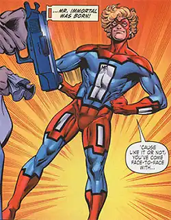 Mr. Immortal is a mutant with the power of immortality, which allows his body to regenerate from any injury, including ones that would kill ordinary humans. Although injuries that are sufficiently traumatic appear to kill him at least initially, his regenerative power causes him to return to life in anywhere from ten minutes[4] to seconds.[2] This rapid healing manifests itself only in response to nominally fatal injuries: when non-fatally injured, he heals at a normal human rate, though such injuries tend to rapidly heal the next time he dies. This ability seems to be unconscious, since he has tried to die by suicide on numerous occasions, only to walk away unscathed afterwards. He has recovered from being shot, suffocated, stabbed, drowned, crushed, starved, dehydrated, exploded, poisoned, decapitated, irradiated, and incinerated.[2] Upon revival, he is often extremely enraged; due to the pain of death. During Dinah Soar's tenure as his teammate, she could utter a vocalization, inaudible to humans, that could bring him out of this state, which Flatman speculated is hypersonic in nature.[4] After having reached maturity, Mr. Immortal's body no longer ages.[12]