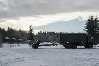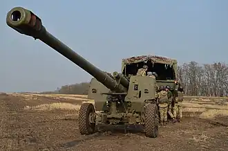 The 2A65 "Msta-B" (named from the Msta River) is a Soviet towed 152.4 mm howitzer. The "B" in the designation is an abbreviation for Buksiruyemaya, which means towed. This weapon has been fielded in Soviet forces since at least 1987 and as of 2022 is currently in service with Russian front and army level artillery units, as well as the militaries of six other countries, most of them former Soviet republics.