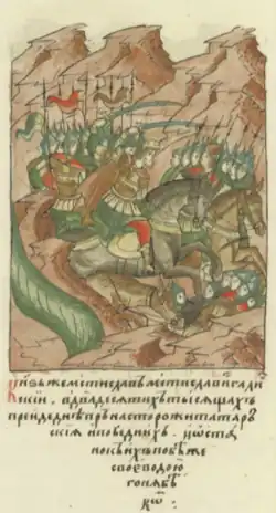 Mstislav on horseback during the battle, miniature from the Illustrated Chronicle of Ivan the Terrible (16th century)