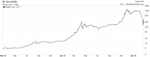 Logarithmic scaled bitcoin price history in USD on the Mt. Gox exchange from February 2012 until its shutdown in February 2014