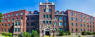 The Mt. Mercy Apartments consists of three buildings. The main building is a five-story lower-case-h-shaped, five-level, Tudor Revival structure. constructed in multiple stages. The original building (dating from 1918) and chapel wing (1920) have structural steel frames and are faced with dark brown-red brick. The west wing (completed in 1944) is constructed of cast-in-place concrete, and is faced with brick that is slightly lighter than the original. The east wing addition (from 1991) is a reinforced concrete structure, and reflects the size, massing and roof line of the west wing. The east wing is faced with brick of a lighter hue than either of the earlier sections.[2] A 2005 rear addition completes the building.[3]