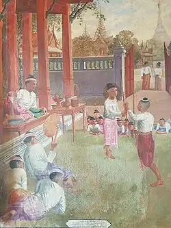While King Hsinbyushin of Burma was residing at Yangon to raise an umbrella crown of the Shwedagon Pagoda for celebration, a Burmese nobleman informed him of a Siamese-skilled muay thai man. The King then stated a royal order to arrange for a Siamese man named Nai Khanom Tom, a famous fighter from Ayutthaya, to confront a Burmese boxer in front of the throne. The first round, the latter collapsed by Nai Khanom Tom, and the other round he confronted nine and ten other Burmese boxers. King Hsinbyushin was applauding him and said that Siamese was in a dangerous situation, but he could confront opponents up to nine and ten while unarmed. Because of King of Ayutthaya's negligent behavior that caused the aftermath of Ayutthaya Kingdom, the kingdom could stay if he's good. King Hsinbyushin then royally rewarded Nai Khanom Tom as should.[46][39]: 414 [Note 8]