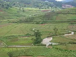 The catchment area of the upper section of the river is in the Mugamba natural region and Bututsi natural region, and includes tributaries such as the Karuyenzi and Kigezi rivers. It slopes steeply down the Congo-Nile ridge to the central plateau, where it slows down.[3] Downstream it flows through the Kirimiro natural region.[11] In its lower section it is joined by the Munyinya river. This region is heavily cultivated.[12] An irrigation dam on the river contains the Mubarazi-Kaniga rice marshes, which cover about 130 hectares (320 acres) and can produce almost 1,000 tons of rice.[13]