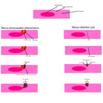 Mucous extravasation phenomenon is a swelling of connective tissue consisting of a collection of fluid called mucus. This occurs because of a ruptured salivary gland duct usually caused by local trauma (damage) in the case of mucous extravasation phenomenon and an obstructed or ruptured salivary duct in the case of a mucus retention cyst. The mucocele has a bluish, translucent color, and is more commonly found in children and young adults.