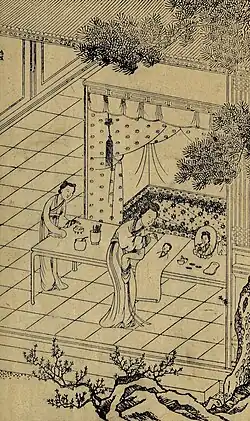 On a fine spring day, her maid persuades Miss Du Liniang, the sixteen-year-old daughter of a senior official, Du Bao, to take a stroll in the garden, where she falls asleep and has a dream. In that fateful dream, Liniang encounters a young scholar (identified later in the play as Liu Mengmei, whom in real life she has never met). Liu Mengmei's bold advances ignite a passionate love affair between the two that flourishes rapidly. A flower petal that drops on Liniang startles her from the romantic dream (according to her soliloquy in a later act, "Retracting the Dream"). However, Liniang cannot get the oneiric love affair out of her mind since and her lovesickness quickly wastes her away. Unable to recover from her fixation, Liniang dies shortly after.