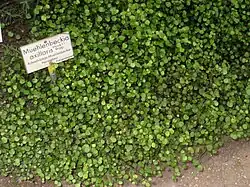 Muehlenbeckia axillaris (creeping wire vine, sprawling wire vine, matted lignum) is a low evergreen shrub, forming wiry mats up to about 1 metre (3 ft 3 in) in diameter, native to New Zealand, and the Australian states of Tasmania, New South Wales and Victoria.[1] It has thin, red-brown stems, with glossy squarish to roundish leaves that are less than 1 cm (0.39 in) in diameter and 2–4 mm (0.079–0.157 in) thick. Flowers are inconspicuous, yellowish-white, 4–8 mm (0.16–0.31 in) in diameter, and borne in groups of up to three in the axils. The fruit is black, shiny, and up to 3.5 mm (0.14 in) long, produced in late summer to fall.