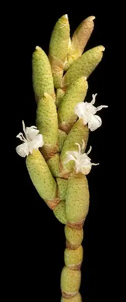 It grows as an erect or spreading succulent perennial herb or shrub, from ten centimetres to a metre high (3.9 in to 3 ft 3 in). Its leaves are reduced to tiny scales sheathing the stem joints. Flowers are white, and occur in terminal cymes. The fruit is a nut.[1][2]