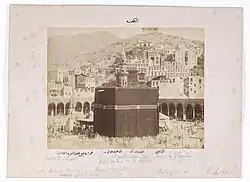 In 1861, he was assigned to visit the region of Arabia from Medina to the port of Al Wajh and conduct a detailed survey. He took a small team and some surveying equipment as well as his own camera; photography was not part of the official mission.[2] His records of the expedition are the earliest known detailed accounts of the region's climate and settlements.[1] His photographs of Medina were the first ever taken there. In 1880 he was assigned to accompany the Hajj pilgrim caravan from Egypt to Mecca as its treasurer. He was responsible for the safe passage of the mahmal, a ceremonial passenger-less litter, to Mecca.[3] Again he brought a camera, becoming the first person to photograph Mecca, the Great Mosque, the Kaaba, and pilgrim camps at Mina and Arafat.[2][3]