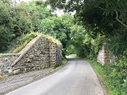 ![]() Remains of the bridge which once carried the railway across the Mullafernaghan Road immediately to the east of the station. | |||||